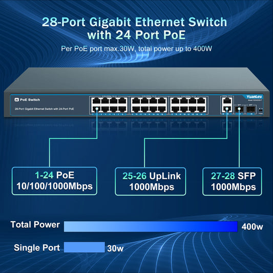 24 Port Gigabit Ethernet PoE Switch with 2 Uplink Gigabit Port & 2 SFP Port, YuanLey Unmanaged 24 Port PoE+ Network Switch, Rackmout, Build in 400W Power, Support 802.3af/at, Plug and Play