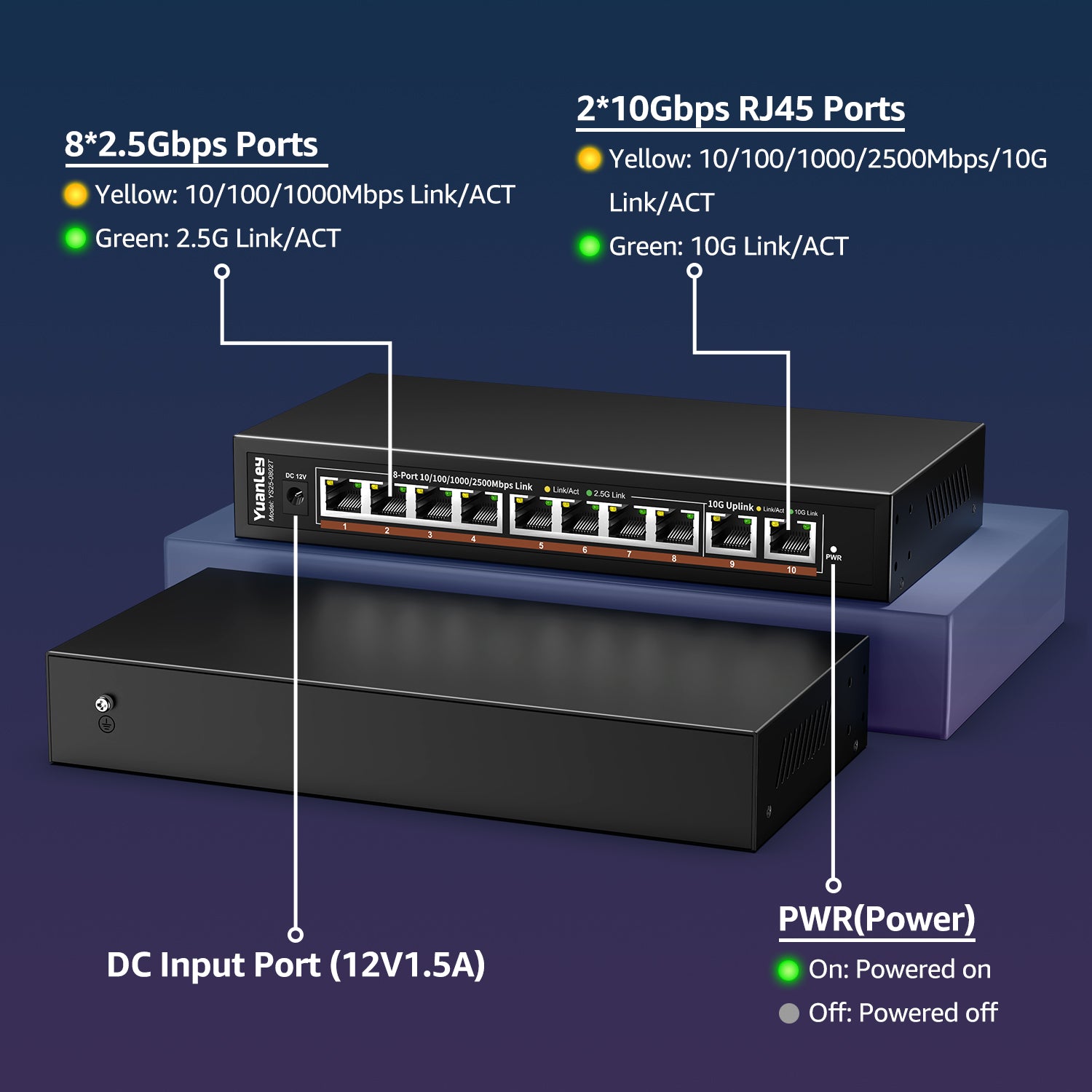 - 【High-Performance 10-Port 10GbE Unmanaged Network Switch】This 10 port unmanaged 2.5G/10GbE Ethernet switch is equipped with 8 x 2.5GbE RJ45 ports and 2 x 10Gbps RJ45 ports, offering flexible high-speed connectivity. Ports 1-8 support 10/100/1000Mbps and 2.5Gbps auto-negotiation, fully compliant with IEEE802.3bz standards, making it ideal for building a high-bandwidth 2.5G Ethernet or 10G home or office network.