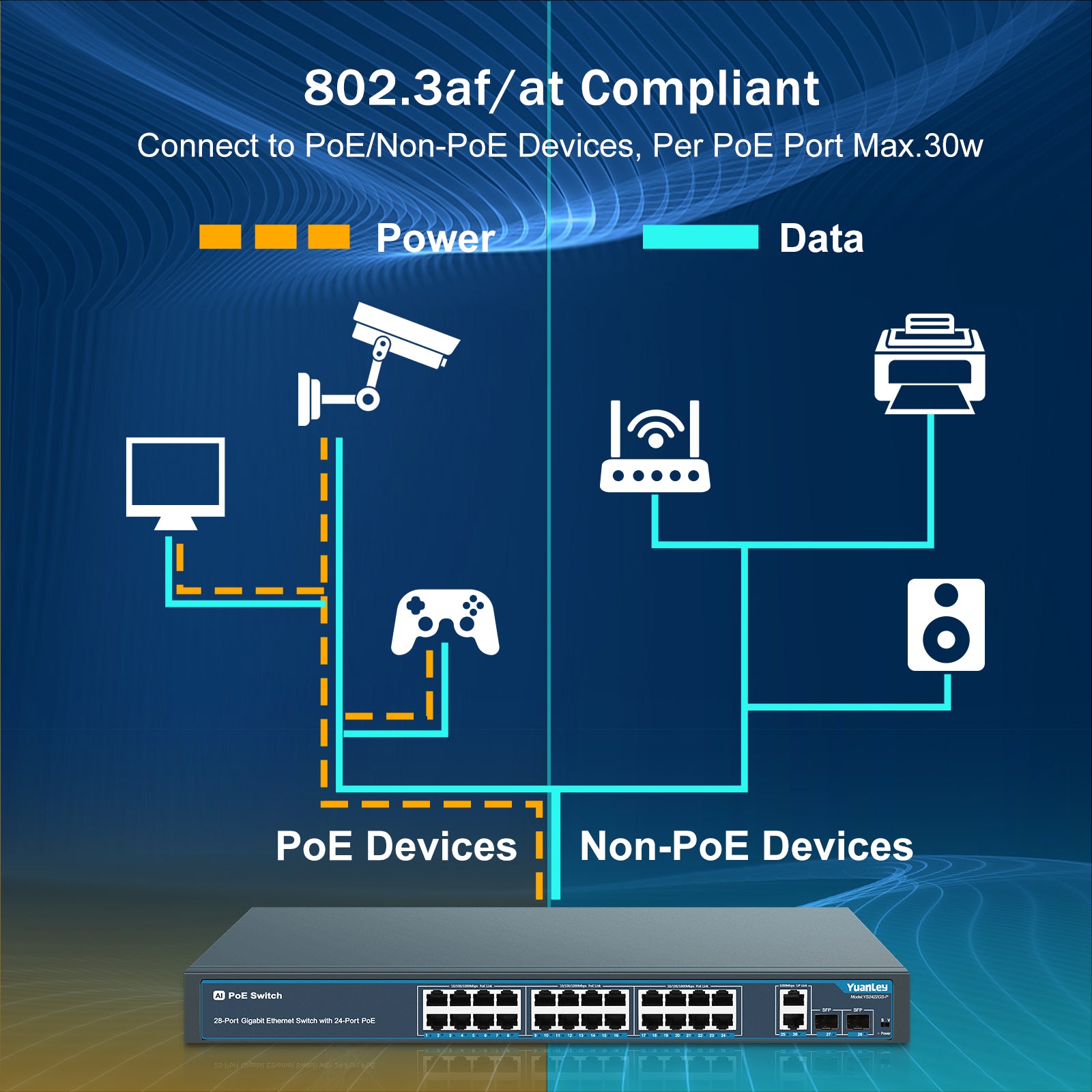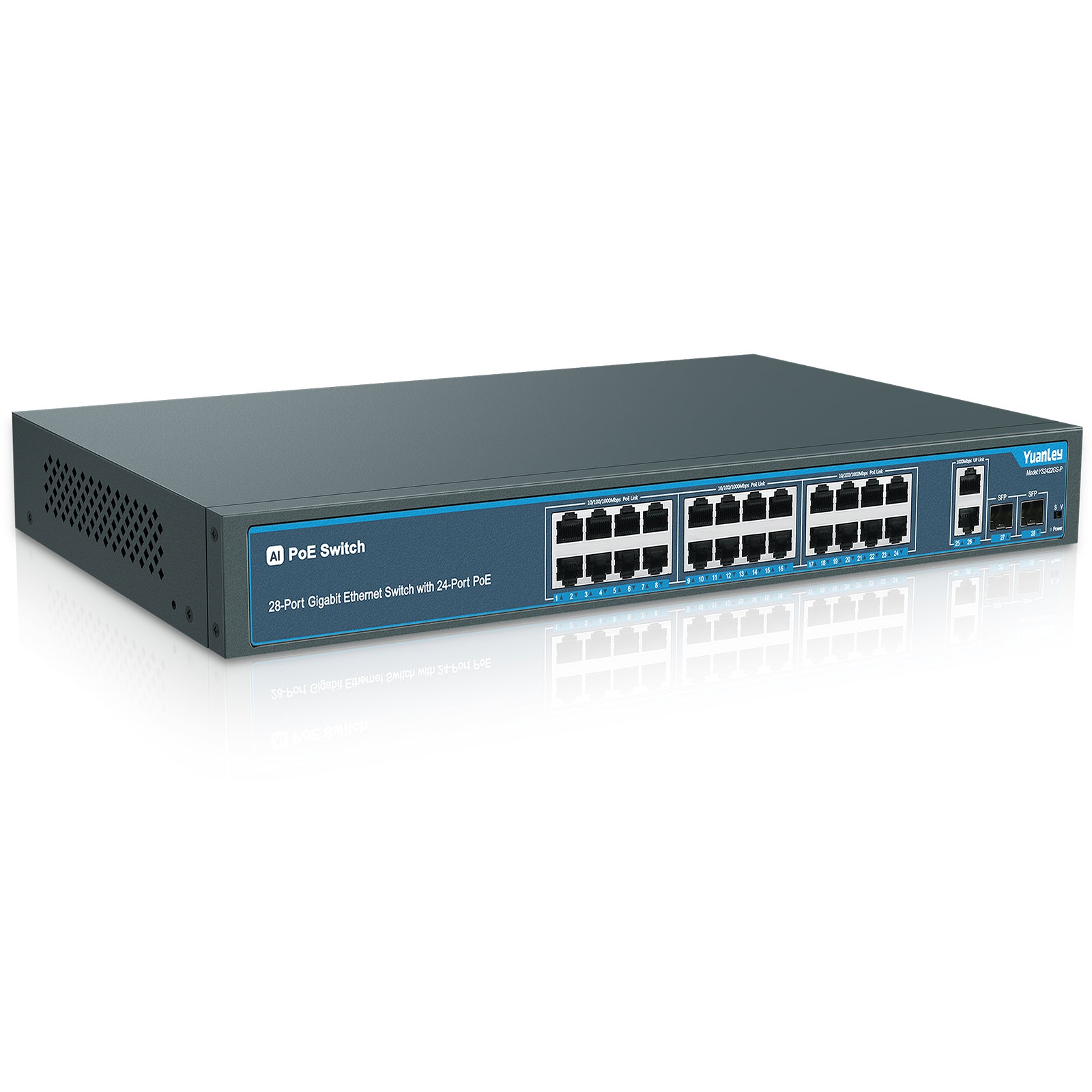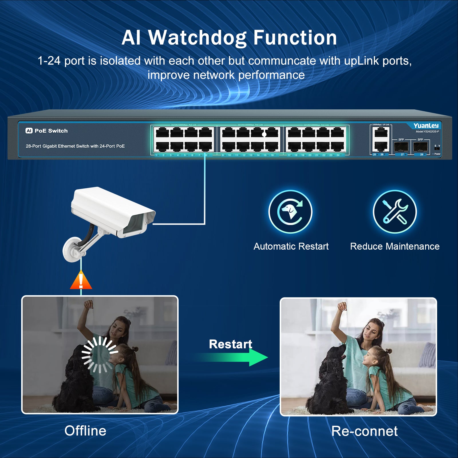 【28 Port Gigabit PoE+ Switch】Total Max 400W internal power budget, up to 30W per PoE port, add-on 2 gigabit uplink port, 2 SFP port. IEEE802.3af/at compliant, automatically detects and identifies PD devices.Support AI Watchdog intelligent detection. Automatically restart the disconnection devices to make operation and maintenance more easier.