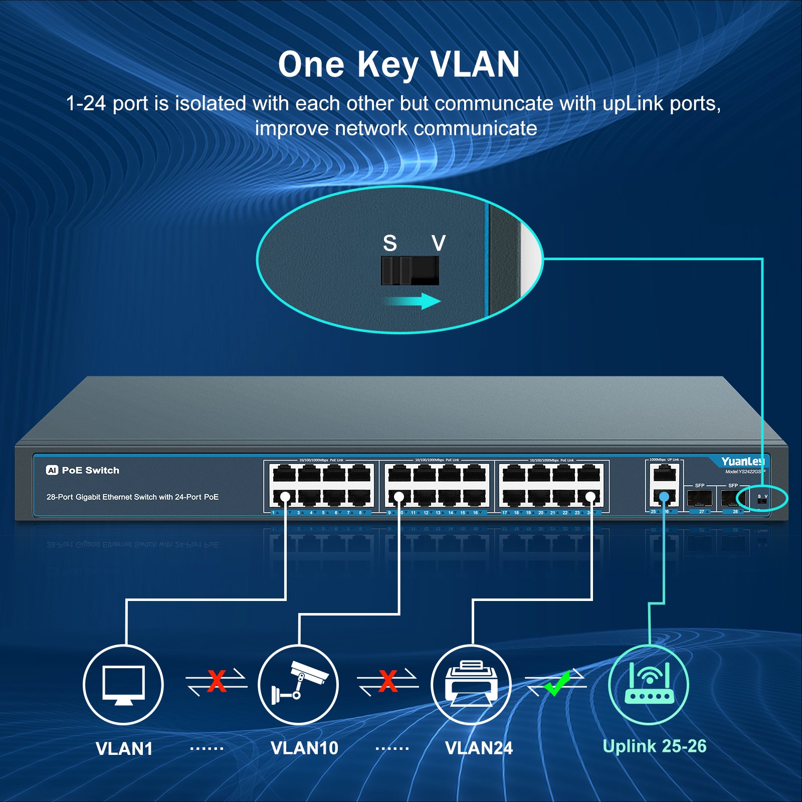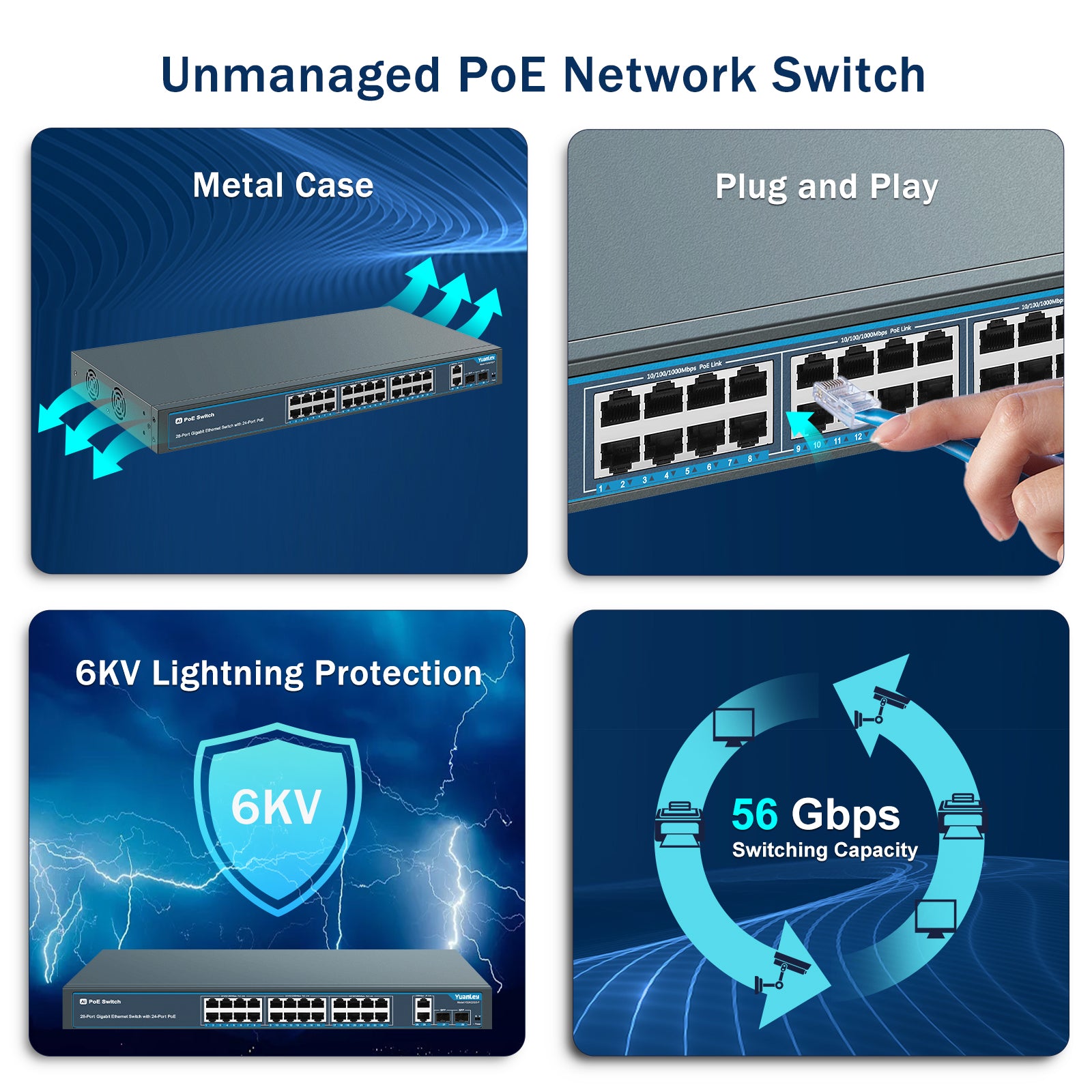 【VLAN Switch】PoE ports will be isolated respectively but can communicate with uplink port,Better Network Bandwidth up to 56 Gbps with higher Security. Ideal for PoE IP Camera, EAP, Access Point, IP Phone and other PD devices.