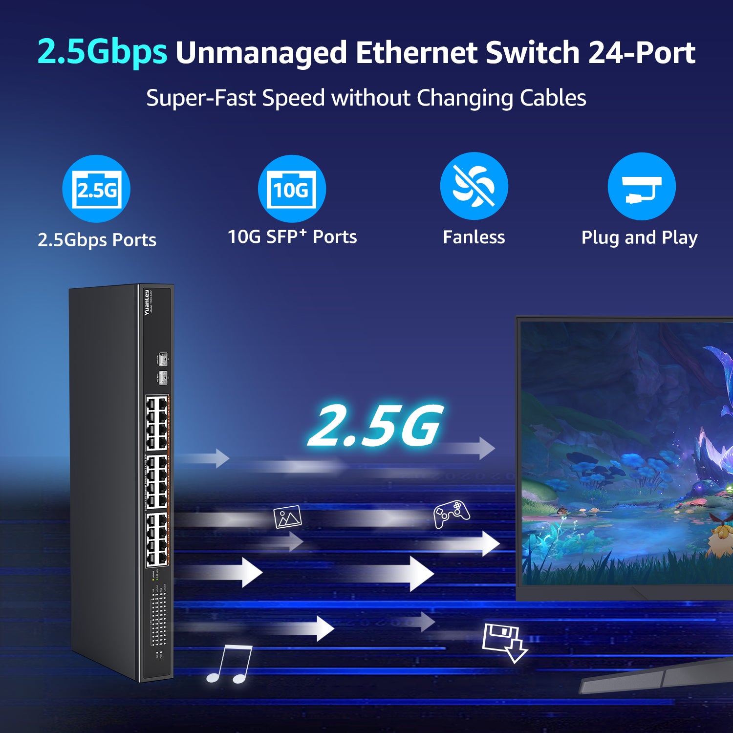【Plug and Play】Unmanaged Plug and Play 2.5Gbps ethernet switch, Just plug in the power cable, connect the ethernet cable to your device and it's easy to use without any configuration.