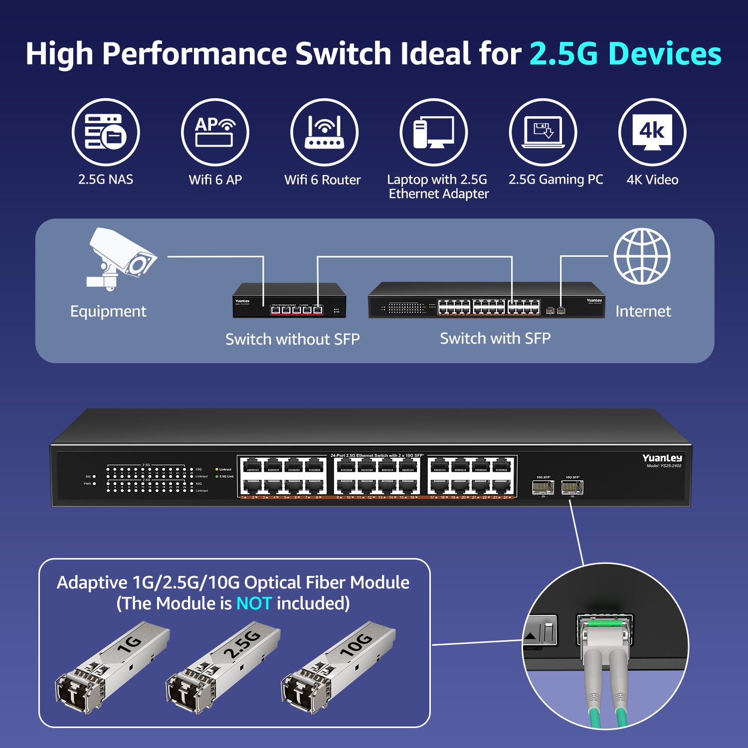 【26 Port 2.5G Ethernet Switch】The network switch includes 24 x 2.5 Gigabit Ethernet ports, 2 x 10G SFP Port (Compatible 1G/2.5G Module, not include SFP Module). Ports 1-24 Compliant IEEE IEEE802.3bz (2.5G) standard, support 10/100/1000M/2.5G adaptive, Auto MDI/MDIX.