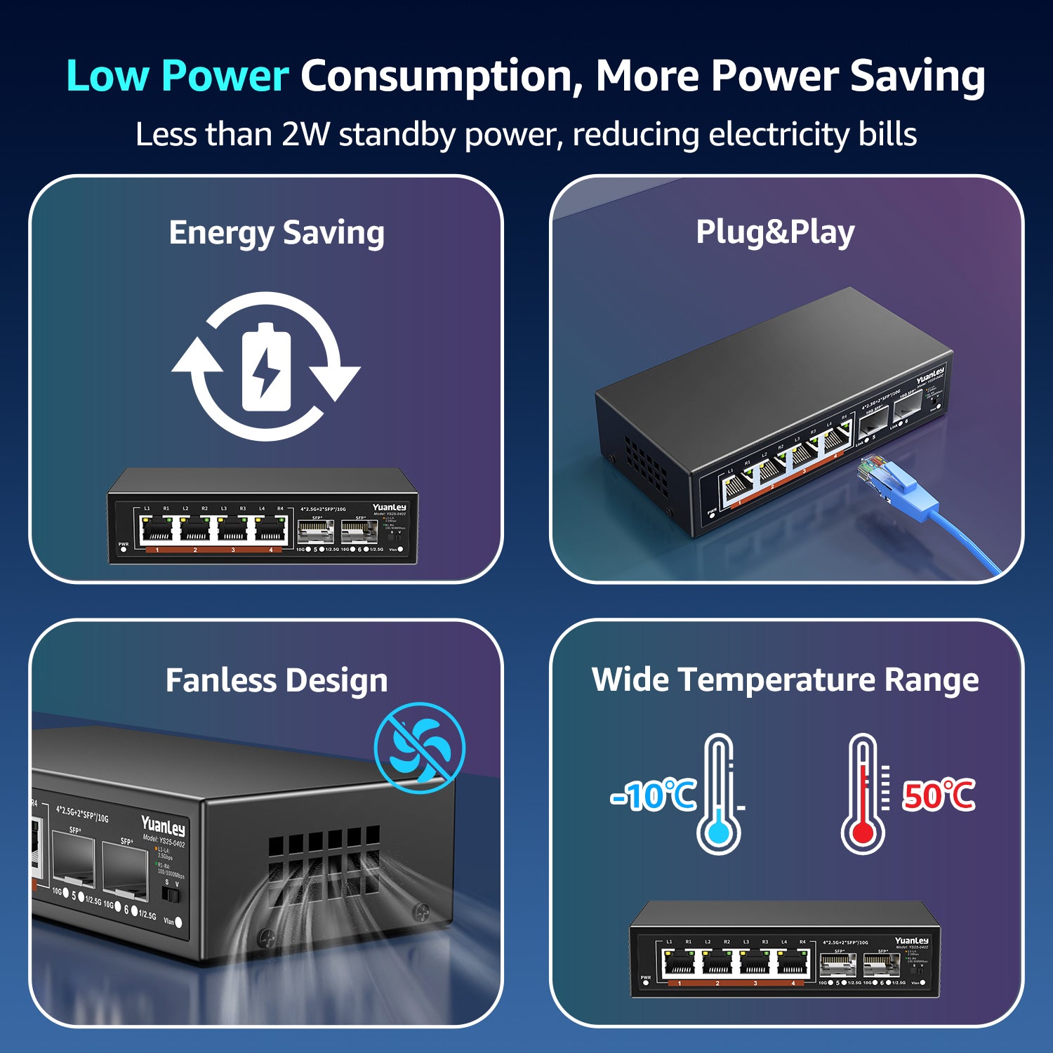 【Stable and Quiet】Durable metal case with 6KV lightning protection, fanless silent design for more power saving, double side cooling holes, wide temperature range -10~50°C, LED indicator lights, stable operation, easy to maintain network status.