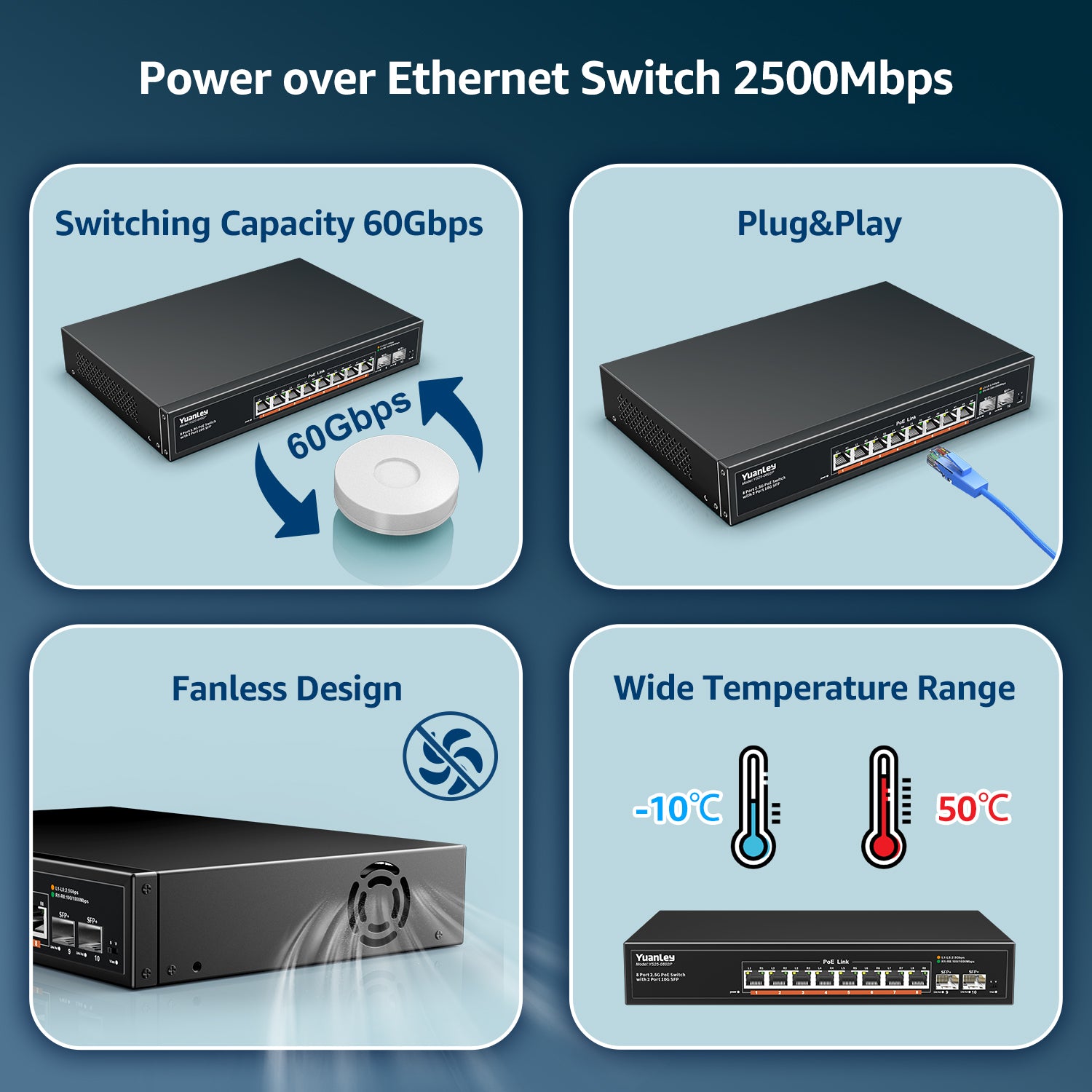 【Stable and Quiet】Durable metal case with 6KV lightning protection, fanless silent design for more power saving, double side cooling holes, wide temperature range -10~50°C, LED indicator lights, stable operation, easy to maintain network status.