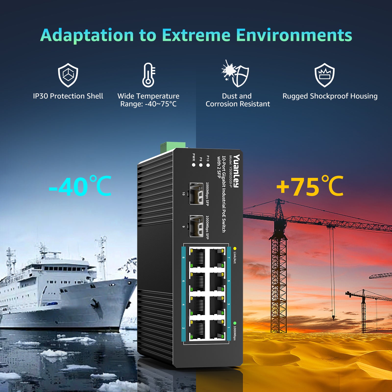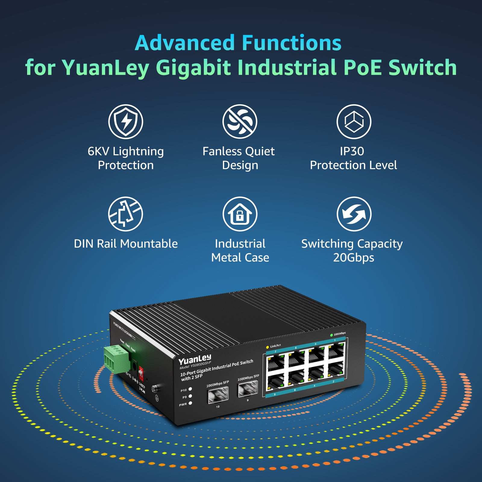 - 【Full Gigabit Ports】YuanLey 10 ports industrial poe switch includes 8 Gigabit PoE/PoE+ ports provide 48V power to PoE devices, 2 Gigabit Uplink and 2 Gigabit SFP port; 1-8 ports support IEEE 802.3af/at. Single port PoE power up to 30W, the maximum PoE output power is 240W, it can automatically detect and recognize the power receiving equipment that meets the standard and supply power through the network cable.