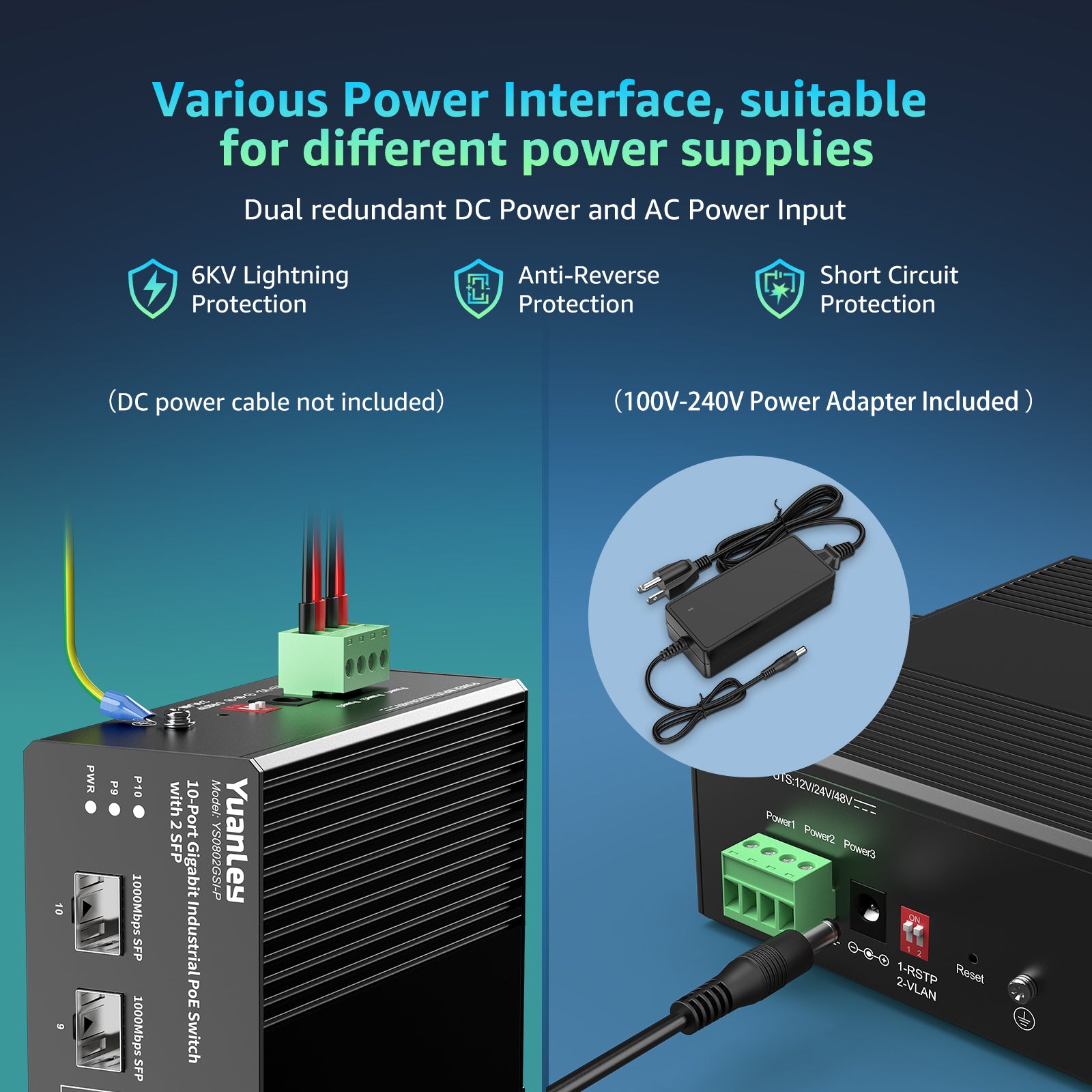 - 【Flexible Power Options】This industrial PoE switch supports dual redundant power inputs, featuring a 100-240V AC adapter (included 120W Power Adapter) and a DC power input (12V/24V/48V, cable not included). Durable metal housing with a fanless design ensures silent, reliable operation. Equipped with DIN rail mounting for easy installation, it's perfect for harsh industrial environments.
