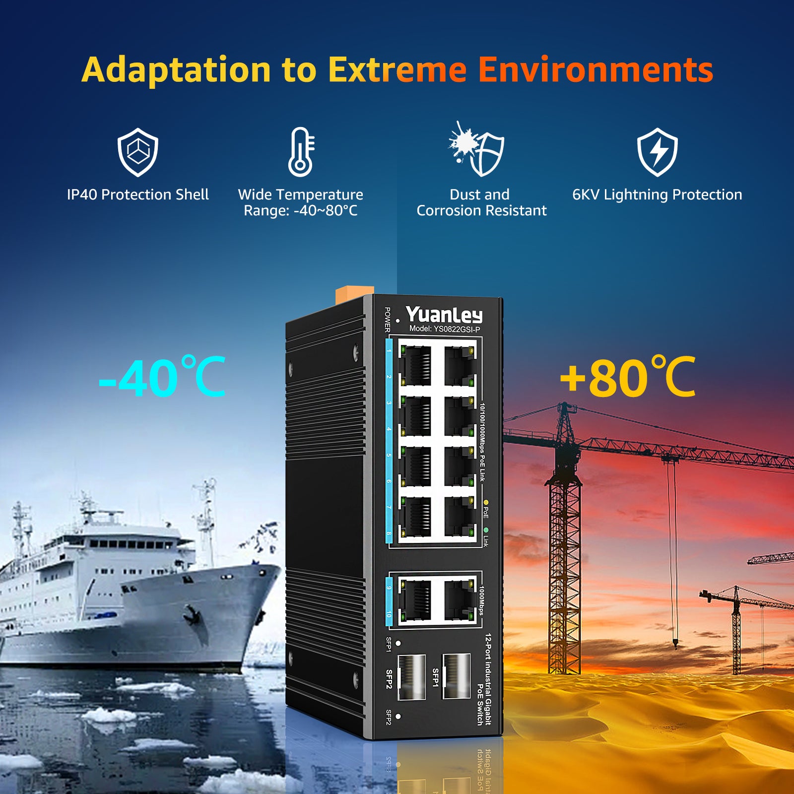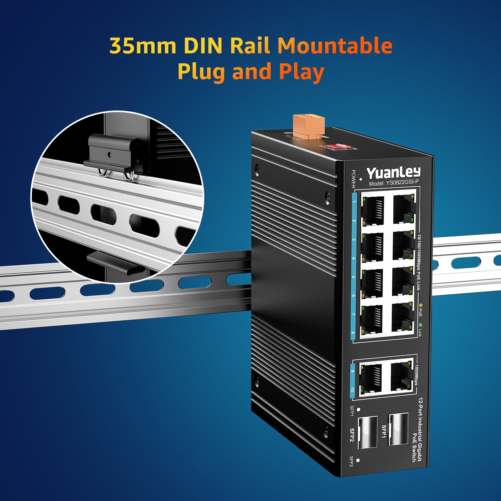 【Full Gigabit Ports】YuanLey 12 ports industrial poe switch includes 8 Gigabit PoE/PoE+ ports provide 48V power to PoE devices, 2 Gigabit Uplink and 2 Gigabit SFP port; 1-8 ports support IEEE 802.3af/at. Single port PoE power up to 30W, the maximum PoE output power is 240W, it can automatically detect and recognize the power receiving equipment that meets the standard and supply power through the network cable.