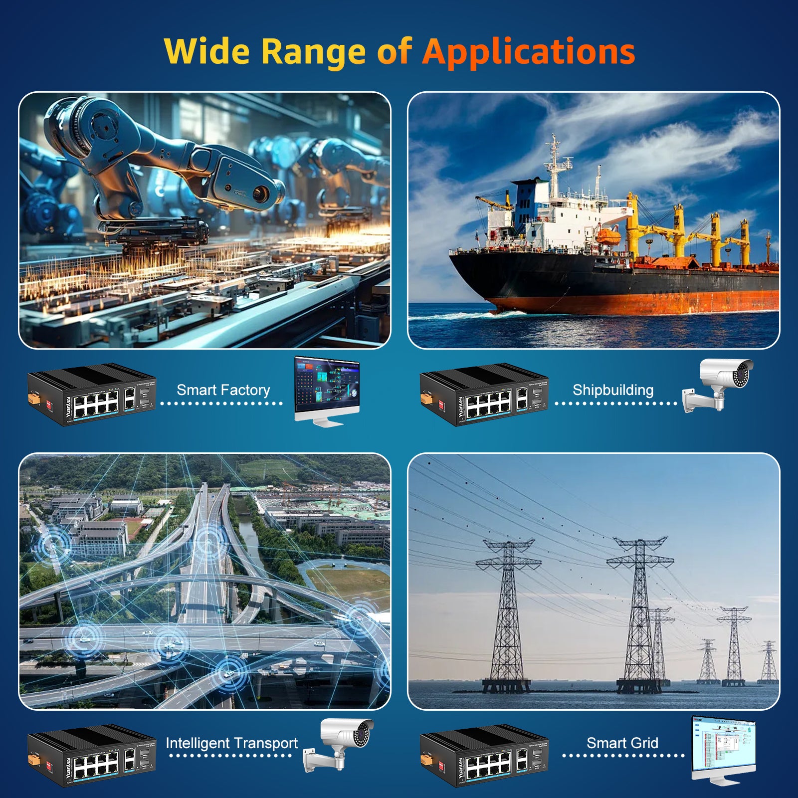 【Highly Reliable Industrial Grade Switches】IP40 protection grade, it can work in a wide temperature range from -40°C to 80°C (-40°F to 176°F). 6KV lightning protection and overload protection. Suitable for Industrial scenes such as metallurgy and green energy construction form a cost-effective, stable and reliable communication network.