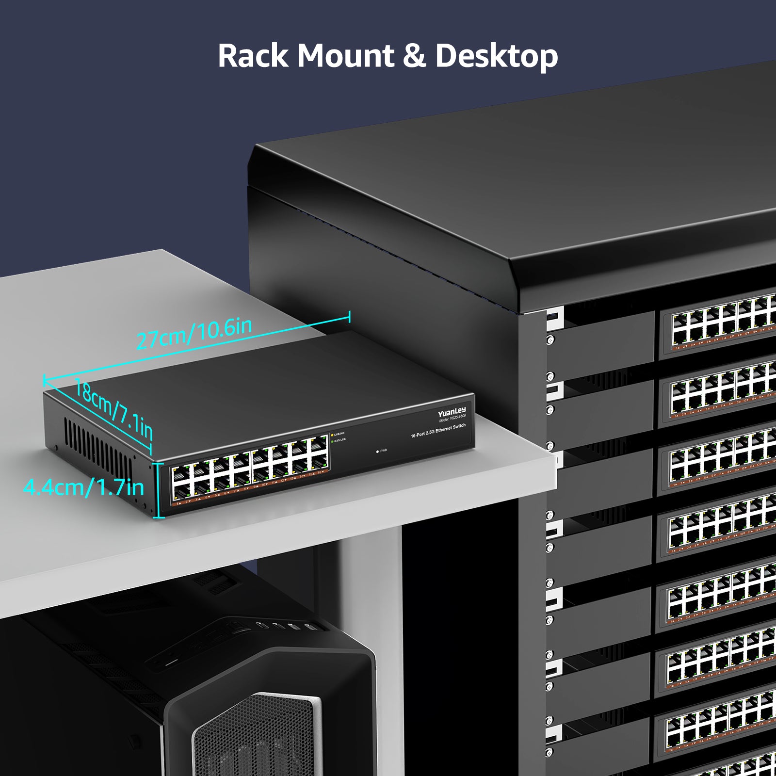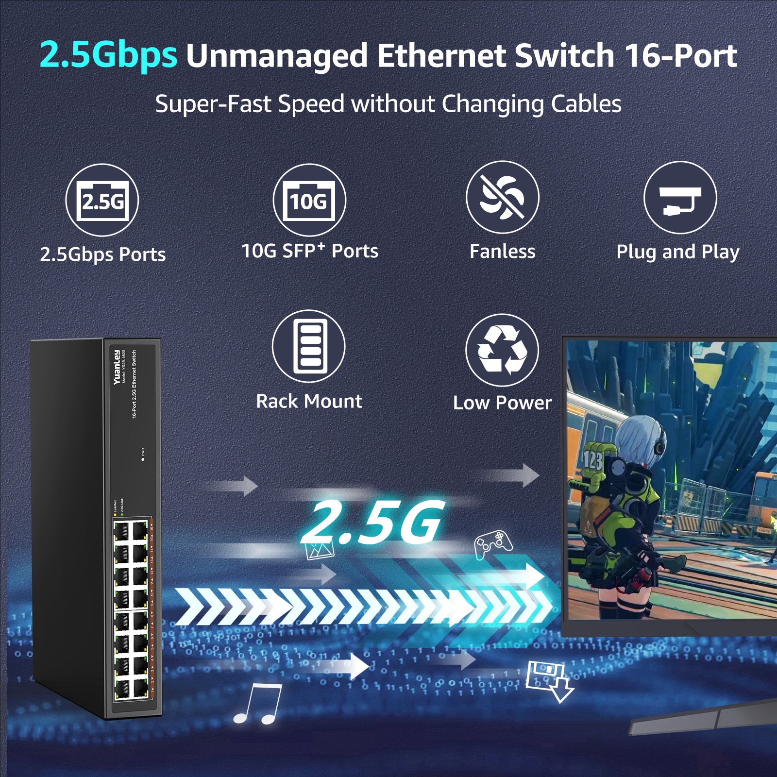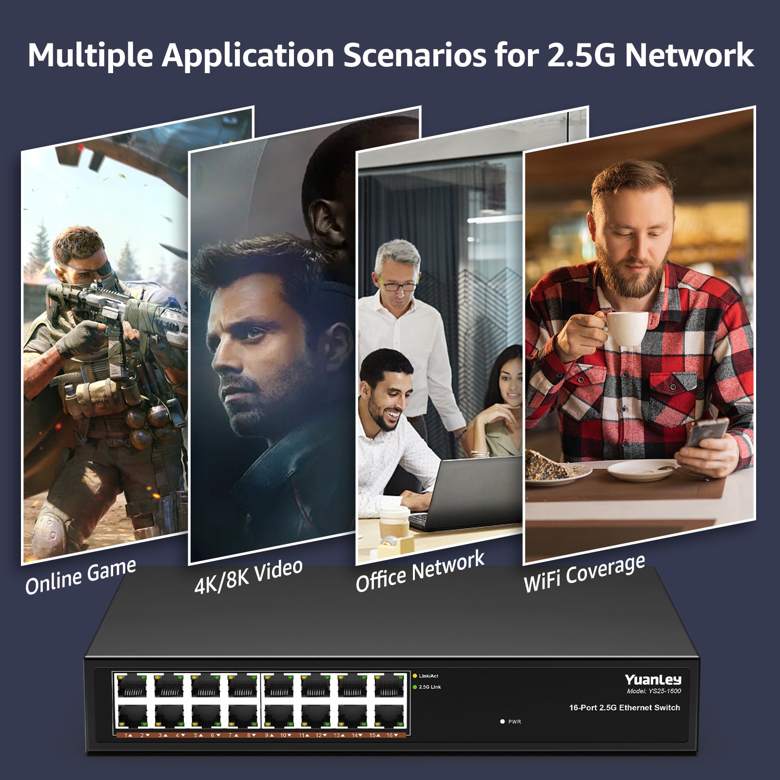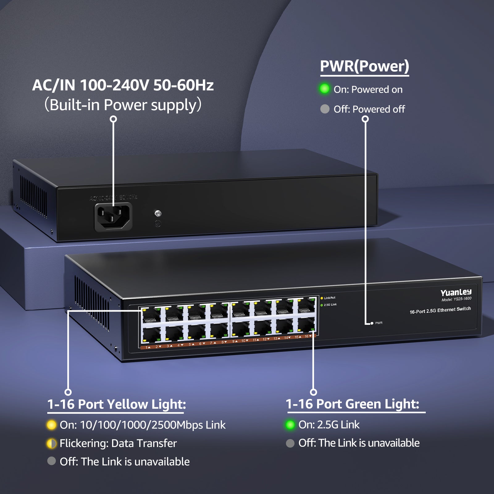 【16-Port 2.5G Base-T Ethernet Switch】Equipped with 16 x 2.5G Base-T Ethernet ports, this high-performance 2.5Gbps switch fully supports IEEE802.3bz standard and offers 10/100/1000Mbps/2.5Gbps adaptive speeds with Auto MDI/MDIX, delivering excellent compatibility across your 2.5G network devices.