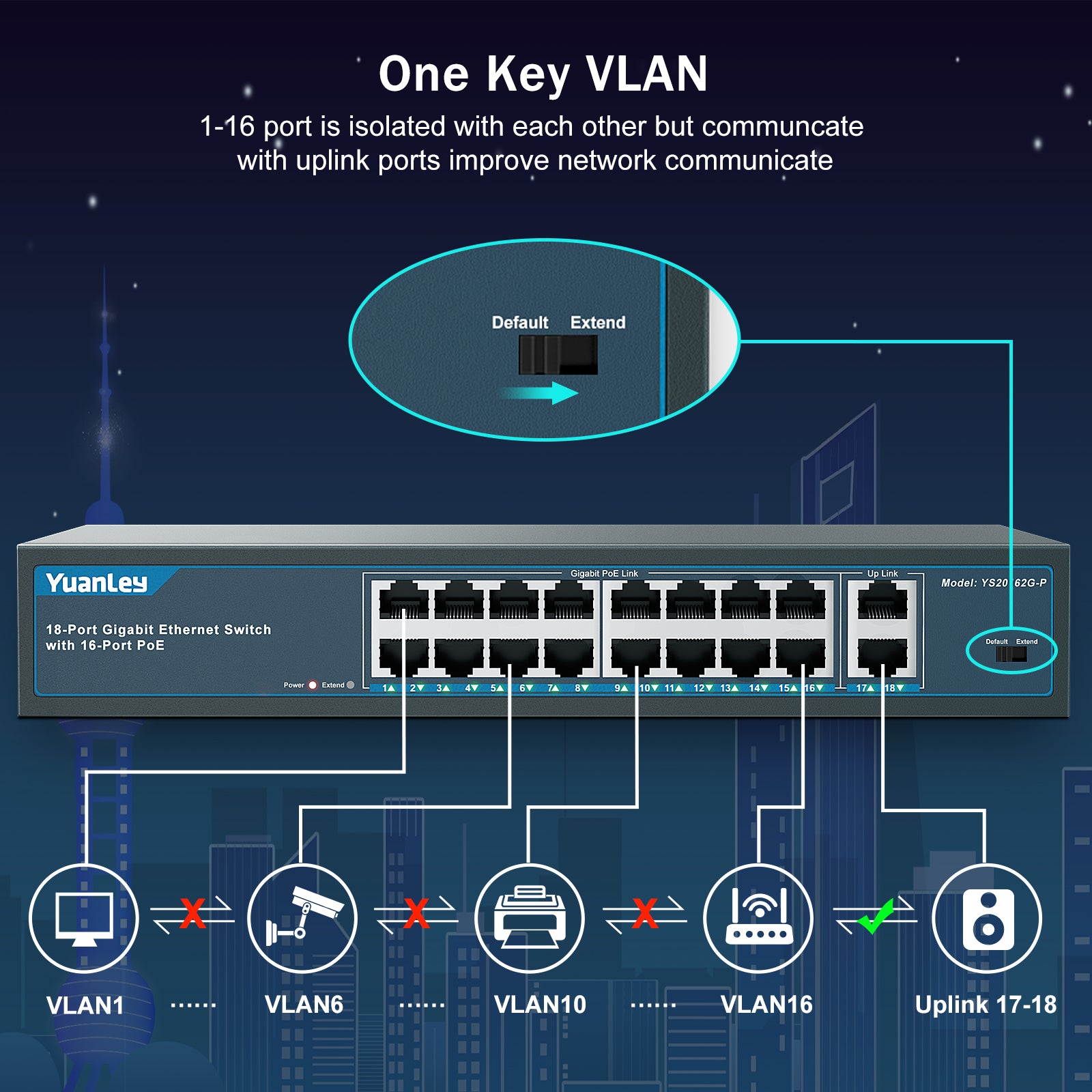 - 【VLAN Function】 The PoE ports 1-16 support VLAN isolation, the traffic are isolated from each other, can only communicate with the uplink 18-19 to reduce network congestion, improve the network performance.