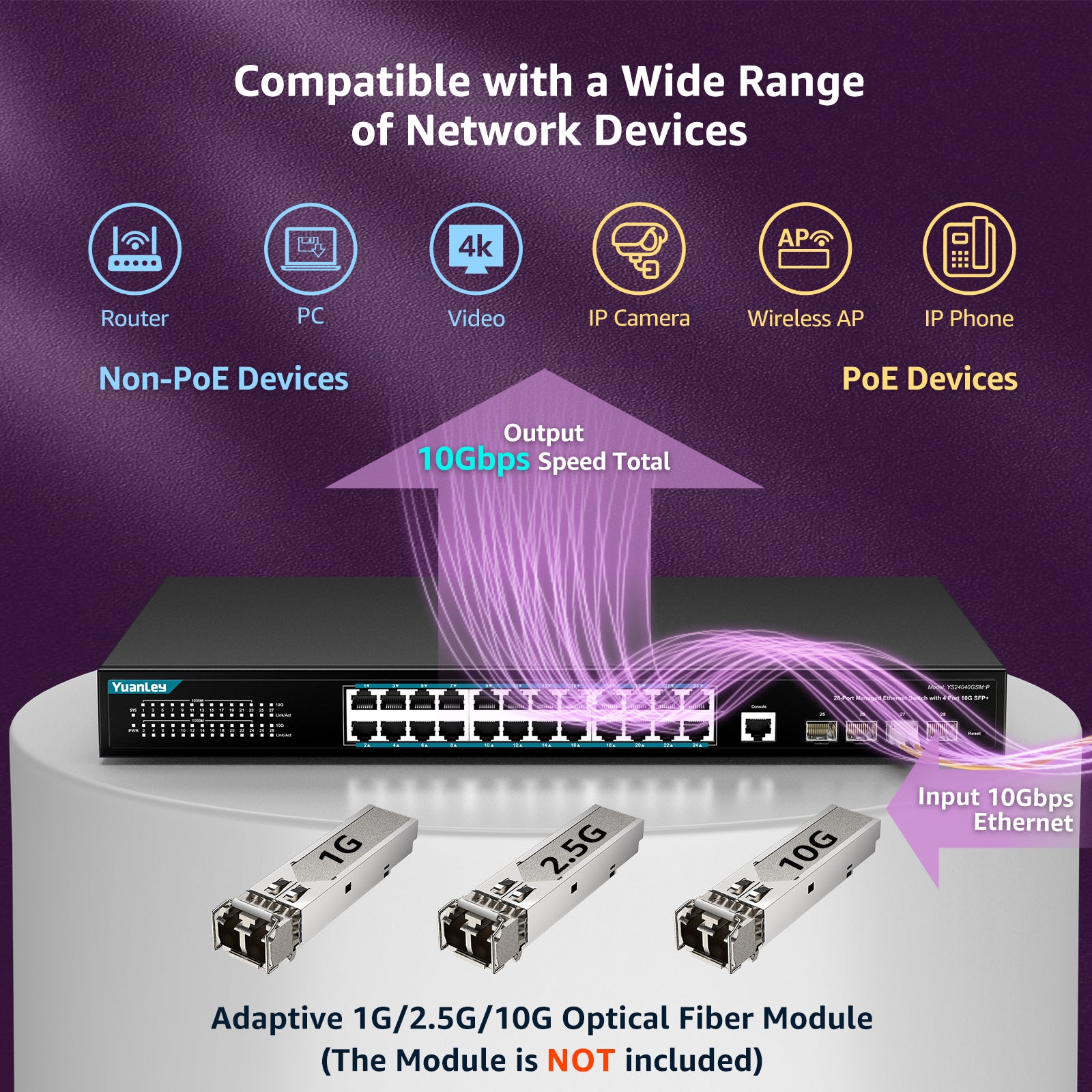 - 【24 Port Gigabit Managed PoE Switch】This network switch from YuanLey is a L3 managed poe switch equipped with 24 Gigabit poe+ ports and 4*10G SFP+ slots. With abundant L3 management features supported, switching capacity 128Gbps, it is capable of delivering high throughput to even the most demanding edge-of-network workgroups, while in small networks it can act as a backbone for Gigabit switches and high-speed servers. 4 SFP+ slots provide greater network flexibility.