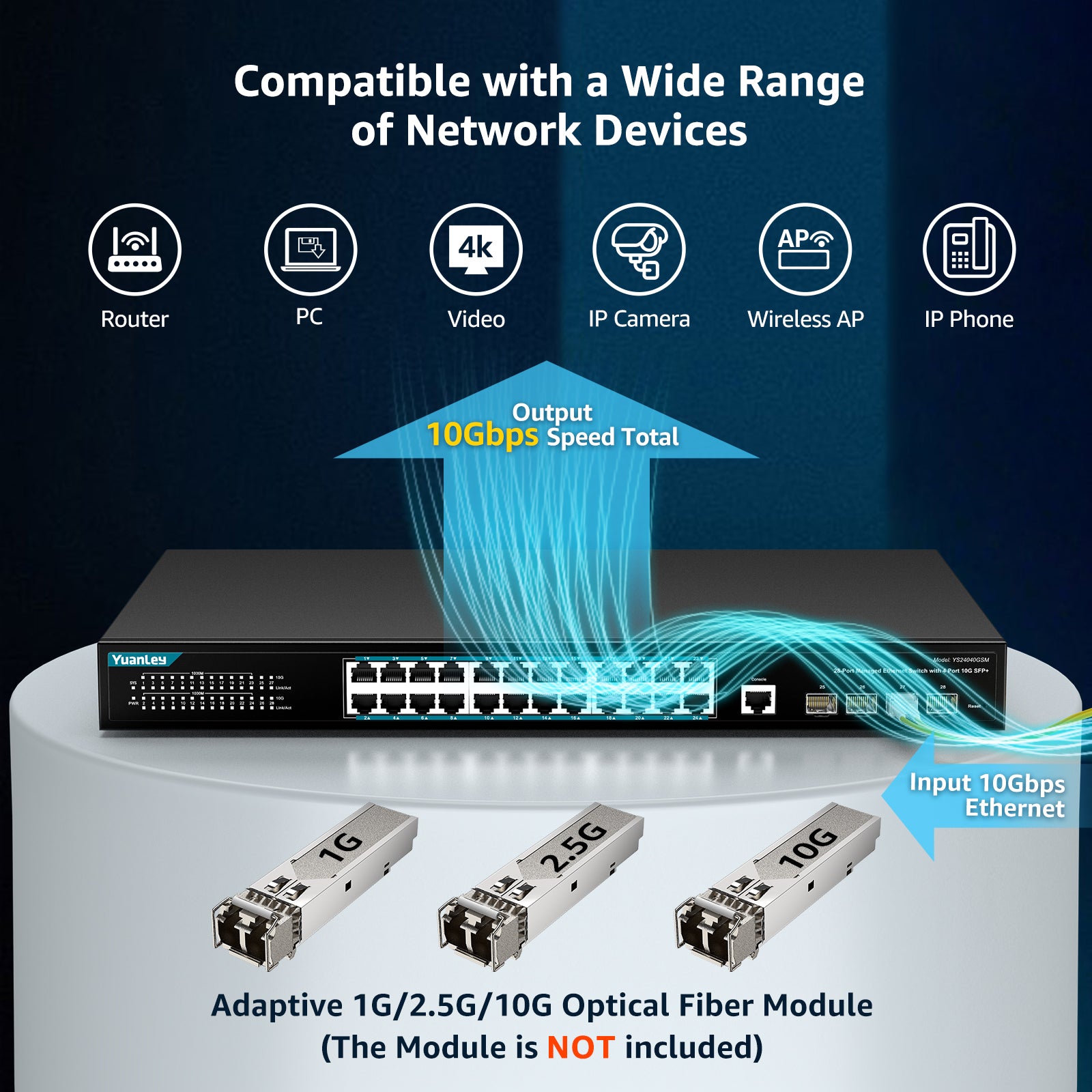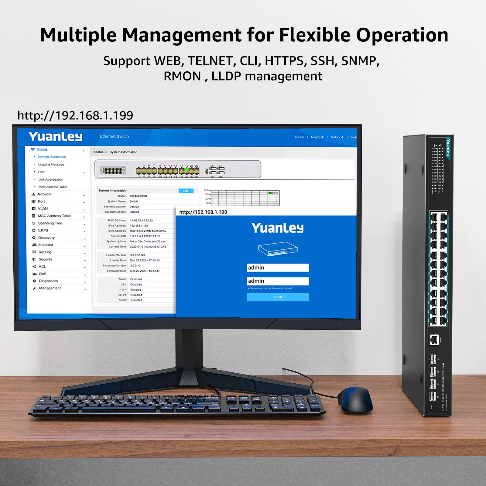 - 【24 Port Gigabit Managed Switch】This network switch from YuanLey is a L3 managed switch equipped with 24 Gigabit RJ45 ports and 4*10G SFP+ slots. With abundant L3 management features supported, switching capacity 128Gbps, it is capable of delivering high throughput to even the most demanding edge-of-network workgroups, while in small networks it can act as a backbone for Gigabit switches and high-speed servers. 4 SFP+ slots provide greater network flexibility.