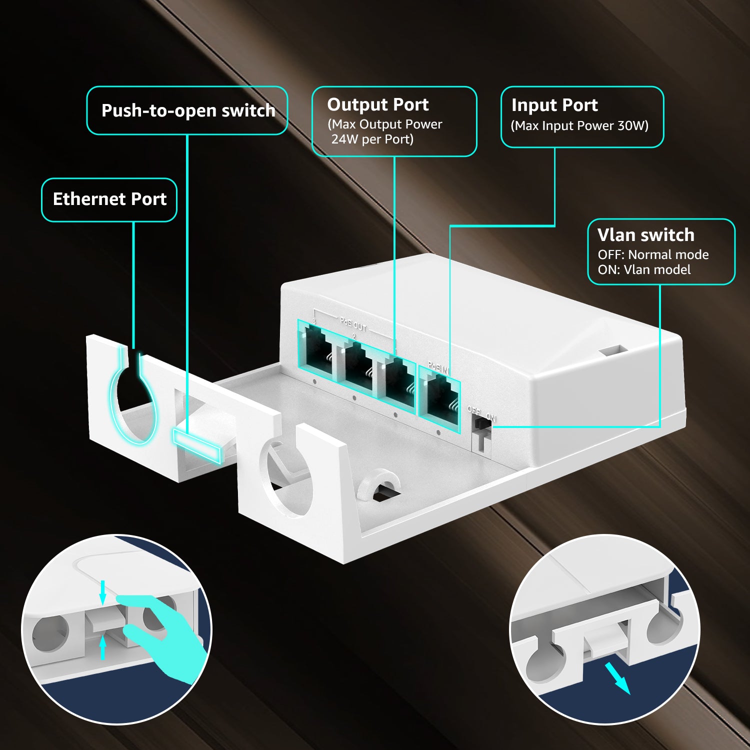 【VLAN and Extend 250m】A single POE out port can handle 10Mbps speed and 250m transmission range when the extend mode is enabled. Out Ports 1 - 3 support VLAN isolation, preventing data leakage, and increase network security.