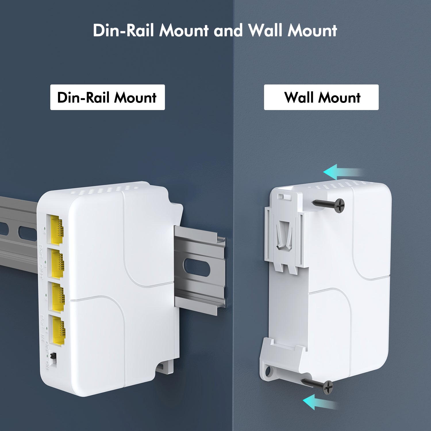 【Widely Application】Compact size (3.2"*2"*1"), supports wall mount and din-rail mount, can be installed anywhere as needed. You can connect AP, IP camera, IP phone etc..