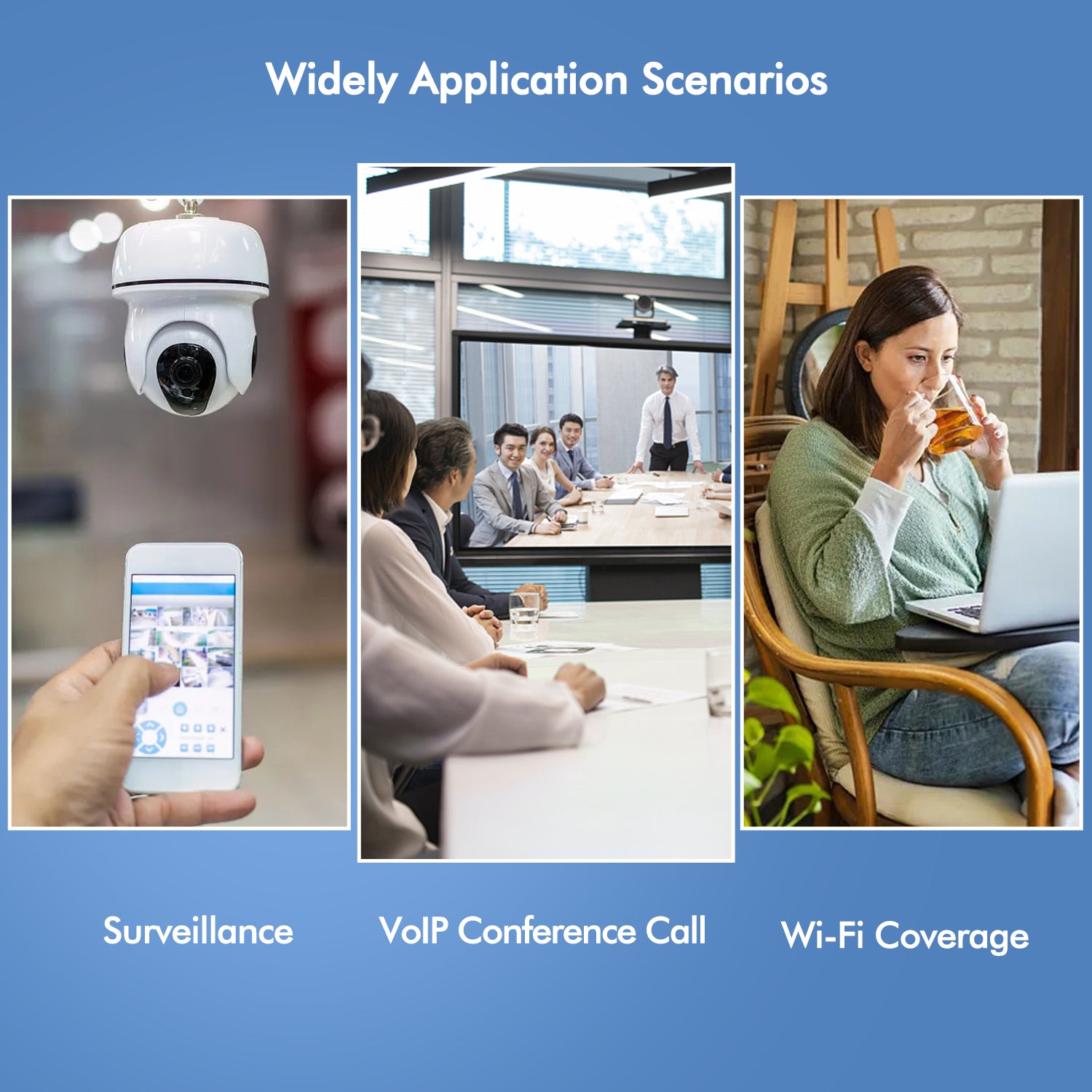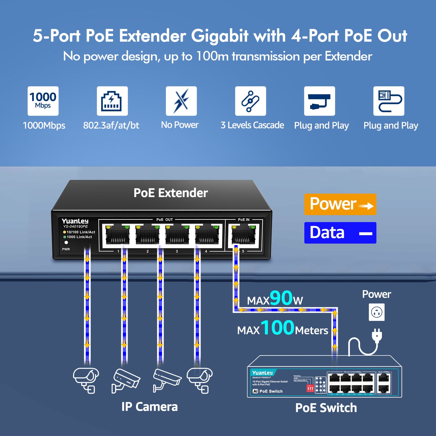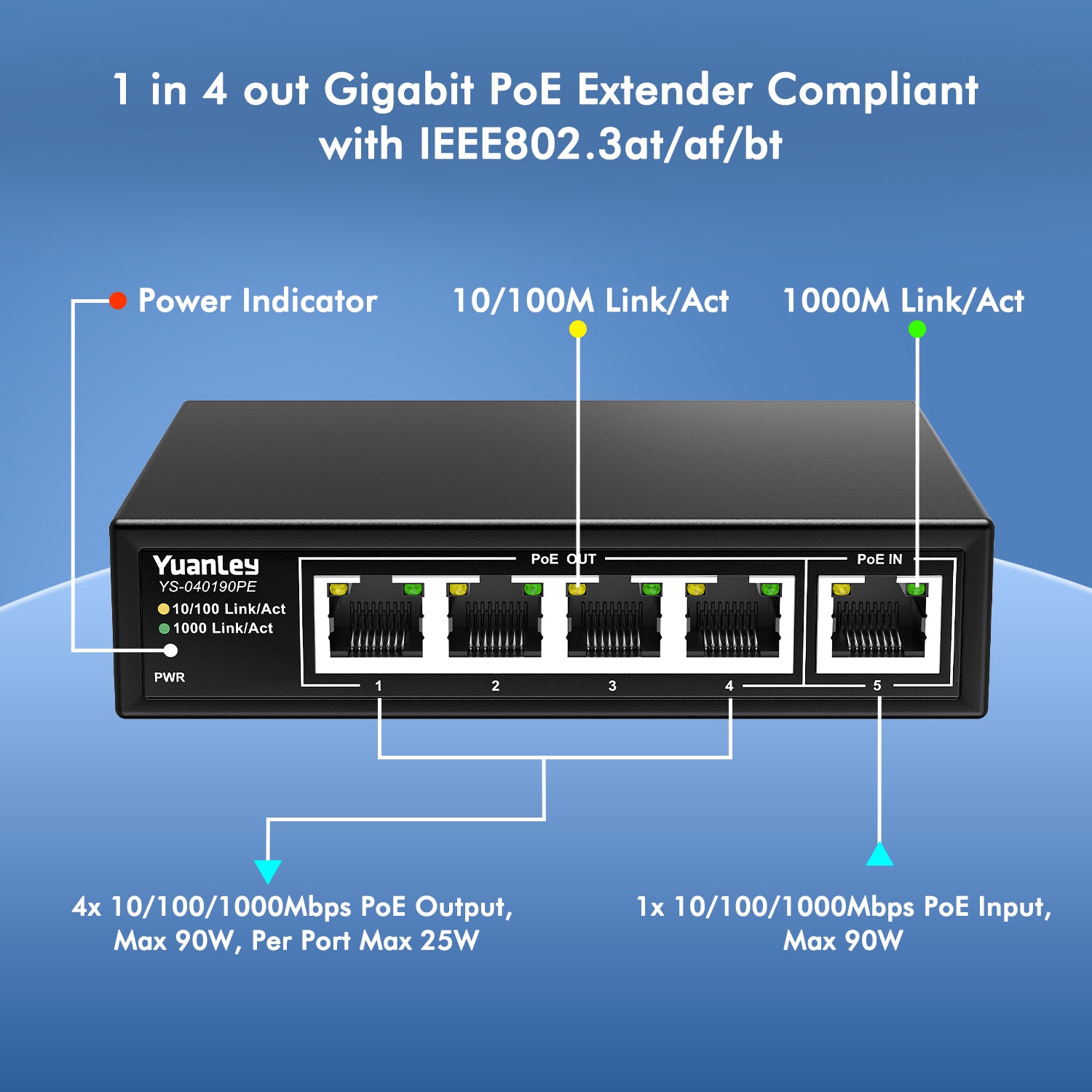 【Gigabit 5 Channel Passive PoE Extender】This 5 port gigabit PoE extender include 4 PoE out and 1 PoE in(Max 90W). It can provides PoE power to up to four PoE devices, 10/100/1000Mbps speed. Each PoE extender has an transmission distance of 330ft(100m).