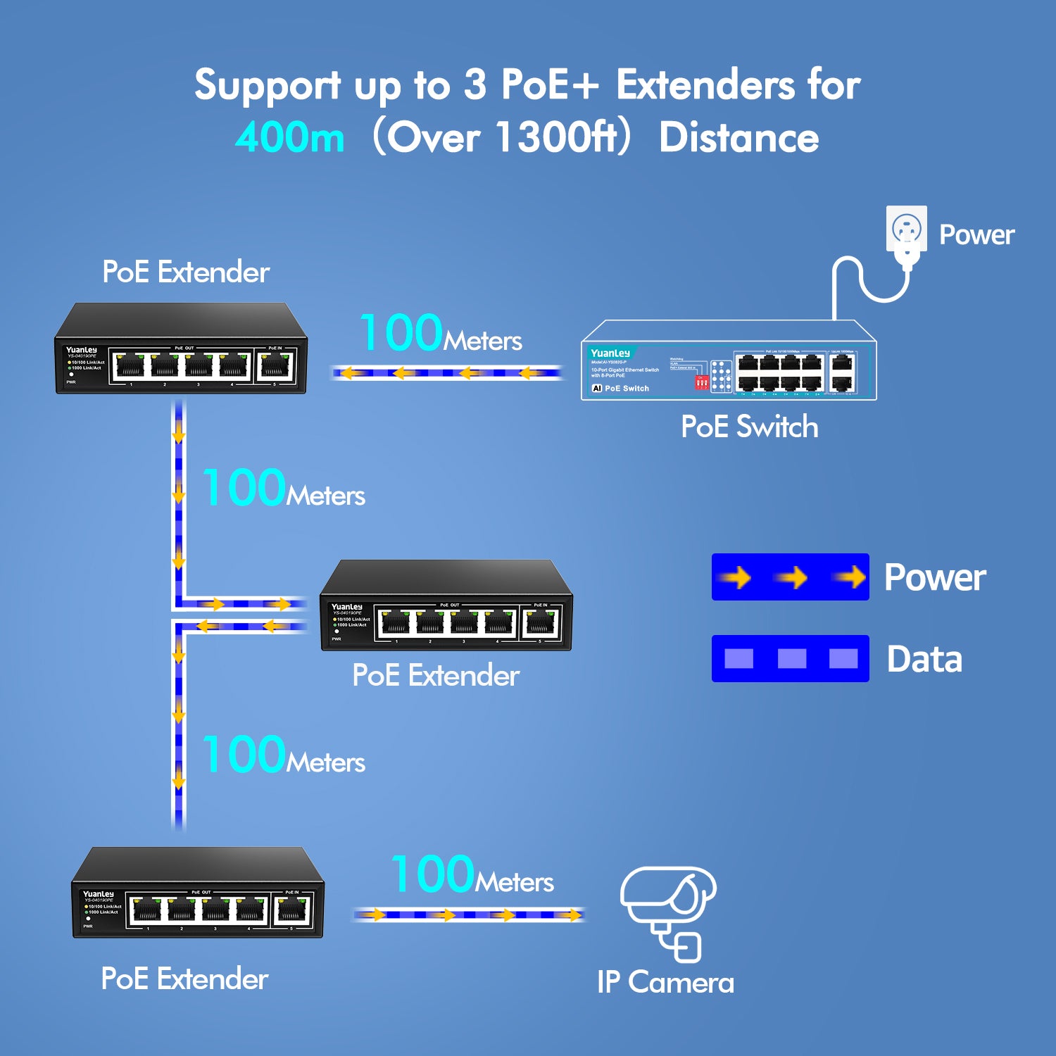 【3 Levels Cascade】Extra 330ft(100m) PoE+ data transmission can be extended through a YuanLey PoE repeater. And it supports 3 levels cascade, therefore, it can achieve PoE data transmission up to 1312ft with 3 PoE extender.