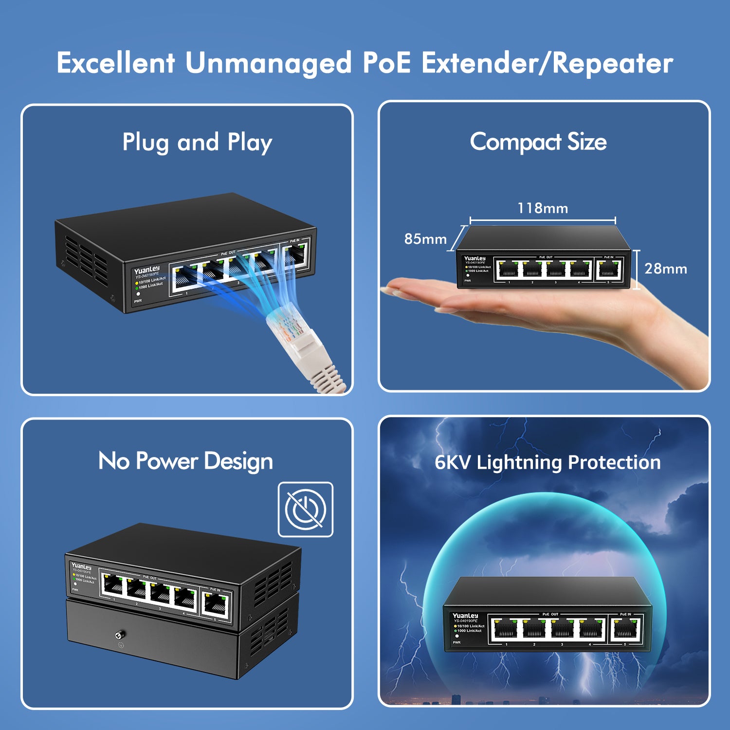 【Unmanaged PoE Repeater】No setup is required, no power, just need a network cable to expand PoE network, plug and play. Supports automatic detection of devices and powers compliant standard PDs.
