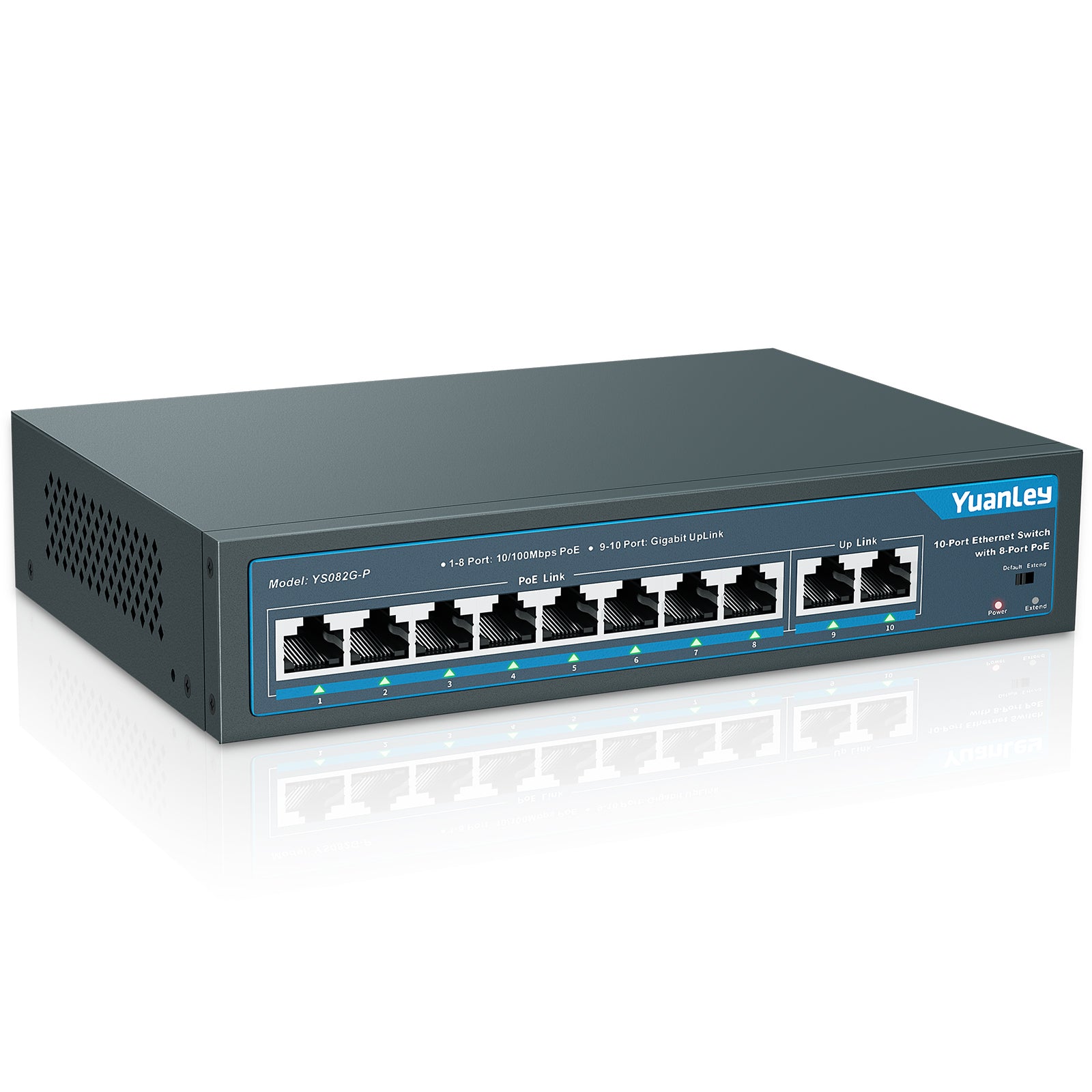 【Port and rate】This poe network switch includes 8 POE ports (10/100Mbps) and 2 Gigabit UpLink ethernet(1000Mbps). The Gigabit Uplink can support more bandwidth than 100Mbps port.