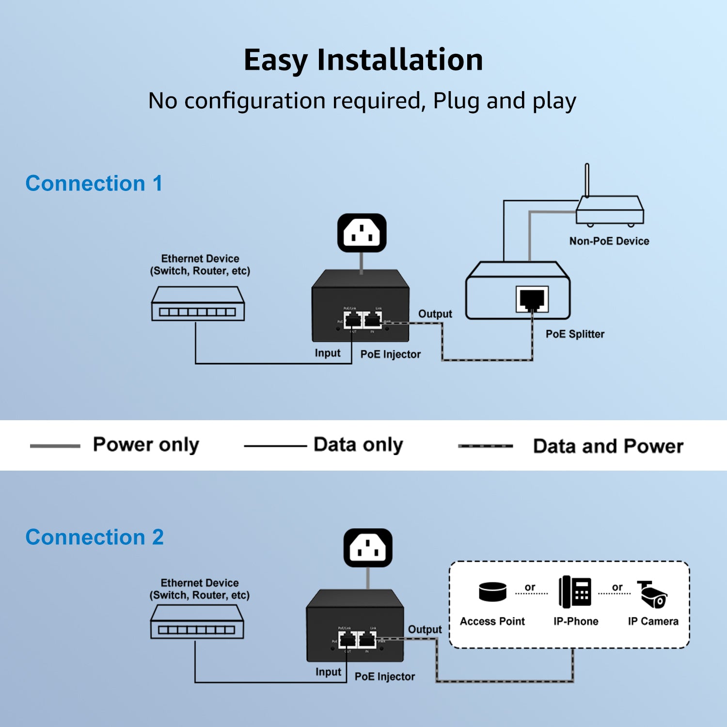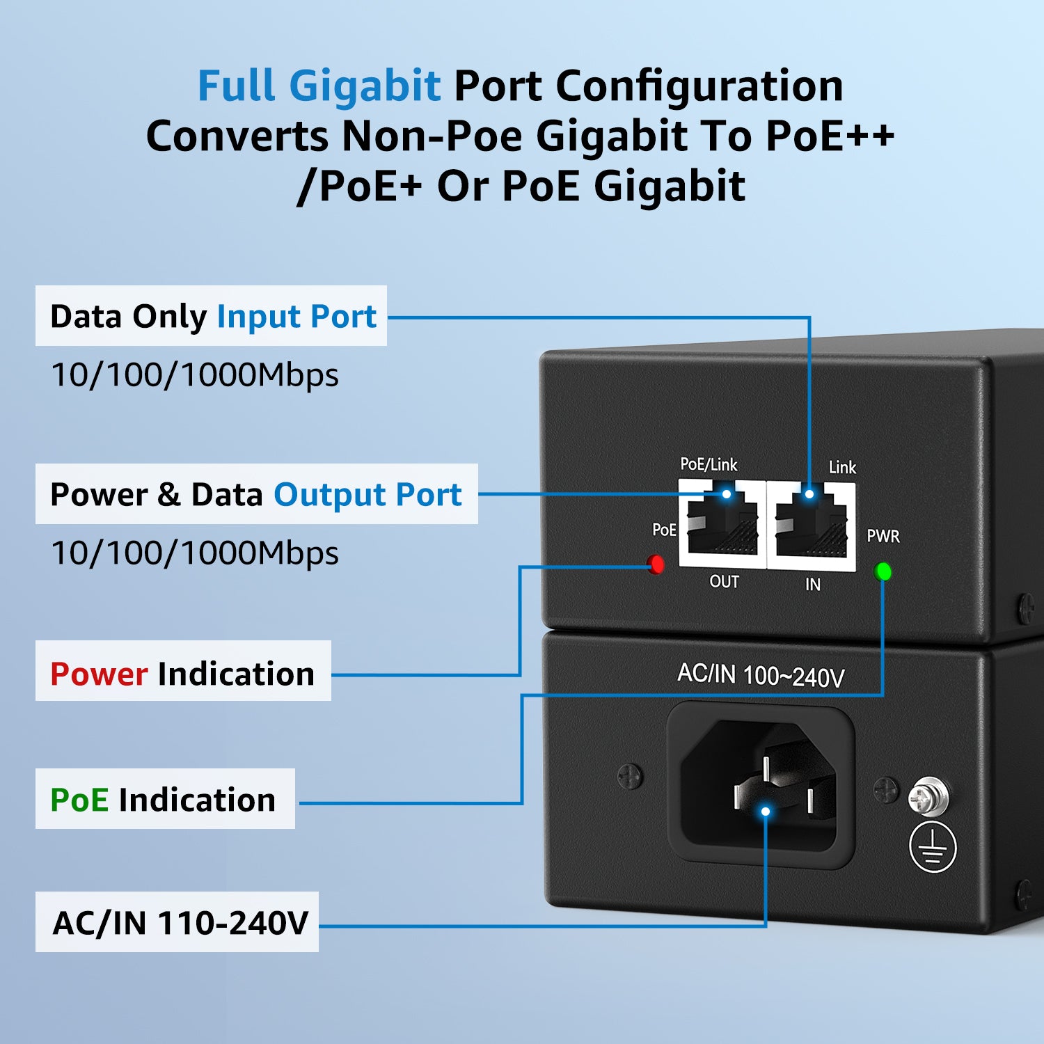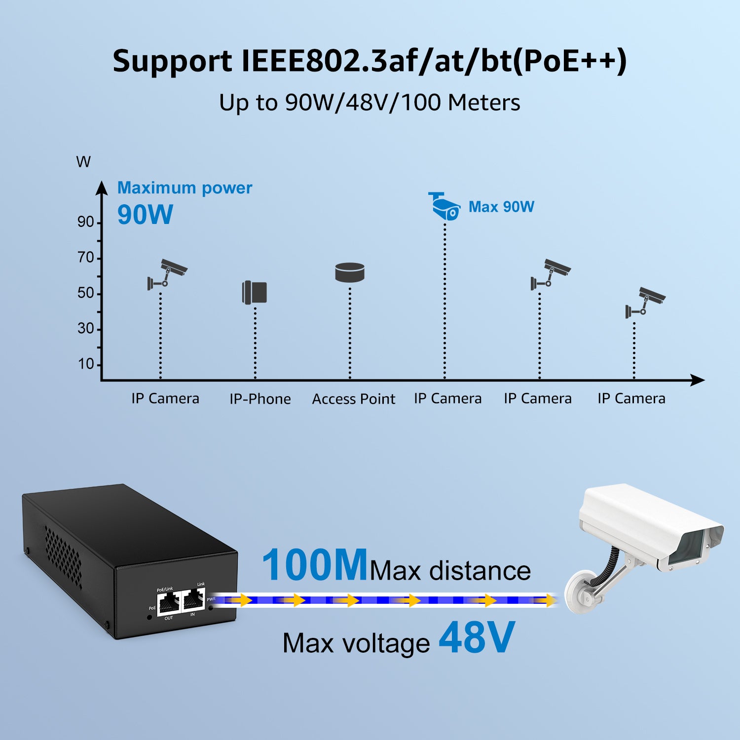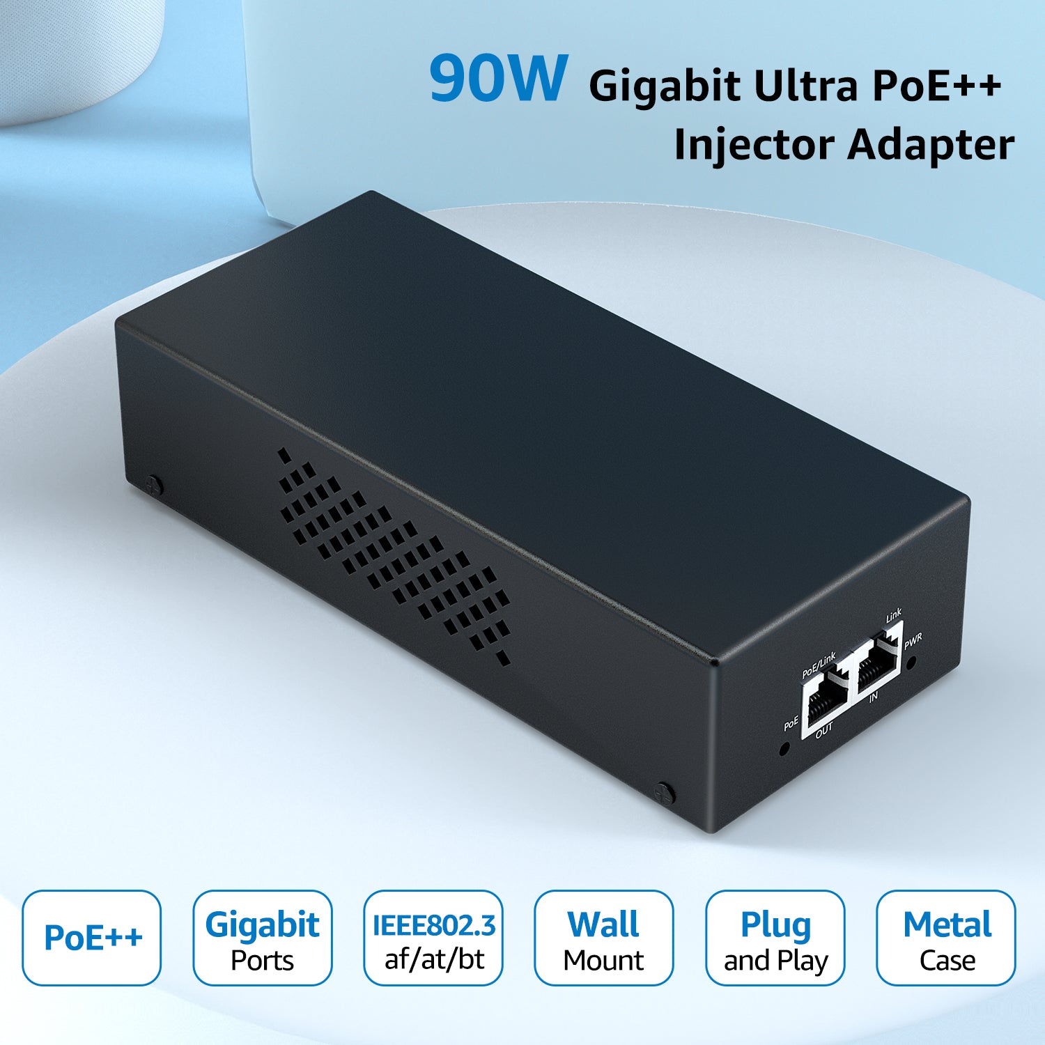 - 【90W Gigabit PoE Injector】Compliant with IEEE802.3af/at/bt, the poe adapter provides 1 Gigabit Ethernet input port and 1 PoE / PoE+ / PoE++ Gigabit Ethernet output port. 90W High power budget and 1000Mbps internet speed.